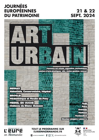 Pour sa 6e édition et pour célébrer les 40 ans des Journées européennes du patrimoine, le Département de l’Eure invite 5 street artistes, Madame, EvazéSir, MonkeyBird, Astro et Ardif et un commissaire d’exposition, Nicolas Laugero Lasserre, à investir 6 lieux patrimoniaux autour de Bernay, Broglie et Mesnil-en-Ouche, les 21 et 22 septembre 2024.