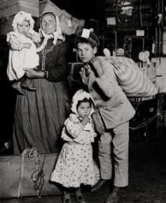 [Visuel : Lewis Hine, Une famille italienne à la recherche d’un bagage égaré, Ellis Island, 1905]