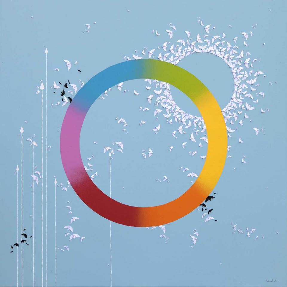 La biodiversité est au centre des préoccupations artistiques de l’origamiste : elle s’attèle notamment à l’inscrire au sein de cercles chromatiques comme pour la faire sortir de ses cases. Au fil des œuvres proposées, des arcs en ciel se détachent sur des gammes de blancs, noirs et ors, avec des fonds et autres assemblages de couleurs qui diffèrent des tableaux texturés auxquels elle nous a habitués. Les origamis de métal dans l’une des installations font écho au papier, et les surfaces lisses s’opposent au relief des feuilles pliées, dans une symphonie de toiles et de supports recyclés et transformés.