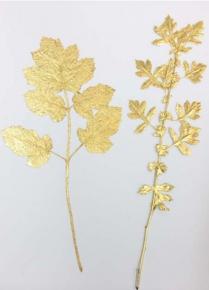 La Galerie Perrotin, Paris présentera d’abord deux grands paysages sur verre, puis six peintures sur un support particulier et nouveau : l’artiste a récolté différents types de végétations, mises à sécher sous presse, blanchies à l’encre et sur lesquelles il est venu peindre à l’aquarelle en suivant les structures organiques. Des fleurs de pavot, séchées, dorées à la feuille, on ne manquera pas d’y retrouver cette forme de cloche si présente dans l’œuvre. Dans une autre salle : une frise de plantes séchées, durcies, également dorées à la feuille au bas des murs. Au-dessus de la frise : plusieurs aquarelles de grand format, des nuages « aux couleurs fauves », sorte de grand ciel menaçant. Dans la dernière salle : un herbier de plantes séchées, dorées, certaines de très grande taille, disposées sur le mur, un peu comme Matisse et ses papiers découpés : « … mais je crois que cela sera impressionnant, comme une jungle ou un été flamboyant. » C’est la première exposition où le monde végétal est si présent dans les œuvres. L’occasion de pointer que l’artiste renouvelle, à chaque exposition, son corpus. Est-ce bien le Lionel Estève dont on a vu l’exposition en 2005 rue de Turenne et il y a trois ans impasse Saint Claude ? C’est un artiste qui expérimente continuellement dans son atelier et ce jour-là, c’est autour de gigantesques feuilles séchées et de la technique de la dorure à la feuille. Plutôt que de disserter sur l’apparition de l’or dans l’univers matériel et chromatique de l’artiste, on rappellera simplement que lorsque la mixtion qui va accueillir la feuille d’or est prête, on dit qu’elle est « amoureuse ». Il y a dans toutes les techniques utilisées un souvenir de l’artisanat, du bricolage, des moments que l’on passe avec les enfants. Lionel Estève réussit en partant de ces gestes simples à produire des œuvres singulières. Souvent, au départ, il y a comme un jeu, une réinterprétation du geste à accomplir: le feutre est utilisé pour « marquer», l’aquarelle va être déposée sur une flaque d’eau, la couleur sera aspirée… Les œuvres seront les plus « légères », Paul Klee insistait sur « ne dire qu’une fois les choses et de la façon la plus simple ».