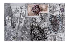Peter Kapeller, né à Vienne en 1969, remet en ordre, lentement, méticuleusement, ses obsessions. Il rumine beaucoup, produit peu. Tout au plus quelques dessins par an, intensément noirs et denses, dans lesquels sédimentent – strate après strate – ses emportements, ses fantômes, ses révoltes et ses espoirs. Dans la nuit de sa petite chambre meublée sommairement, il déploie dans ses oeuvres tout un journal intime à la manière d’un théâtre d’ombres. Il n’y laisse rien totalement à nu, rien n’y est “donné à voir”, car partout les fausses pistes et les repentirs affleurent, partout il faut se frayer un chemin dans l’obscurité du sens pour parvenir jusqu’à l’auteur. À examiner ses bribes d’insomnie, l’on se raccroche comme l’on peut à des lambeaux de phrases, à des silhouettes surgies d’un enchevêtrement de lignes, à des lueurs et des colorations ménagées dans ce tumulte ou gagnées sur cet océan d’encre. Il y a là aussi des noms qui attestent que Kapeller est un observateur lucide – à défaut d’en être un acteur à part entière – du paysage culturel de son pays : on y croise Elfriede Jelinek, sœur d’affliction, Thomas Bernard, frère de génie ou Herman Nitsch, “salaud” abhorré. L’œuvre de Peter Kapeller est le témoignage déchirant d’un homme qui est intimement, viscéralement convaincu que l’art le sauve. Et, pour que ce processus soit complet, il nous prend à témoin de cet “œuvre au noir”. Car, comme l’écrit Claire Margat, “seul un désir inextinguible de chroniquer cette lutte pour la survie, seul l’effort tenace d’en donner un aperçu sous la forme opaque de feuilles de papier noircies à l’encre sur lesquelles surgissent çà et là, comme pour donner un visage au néant qui les environne, des fragments de discours ou des figures amputées, le fait tenir : parce qu’il parvient malgré tout à tenir le journal de bord de ce naufrage permanent.” Après l’exposition que lui avait consacrée Chris Dercon au Haus der Kunst, à Munich, en 2010, il s’agit de sa première exposition monographique en galerie. [Visuel : Masterpiece de Peter Kapeller; Source : communiqué de presse] |