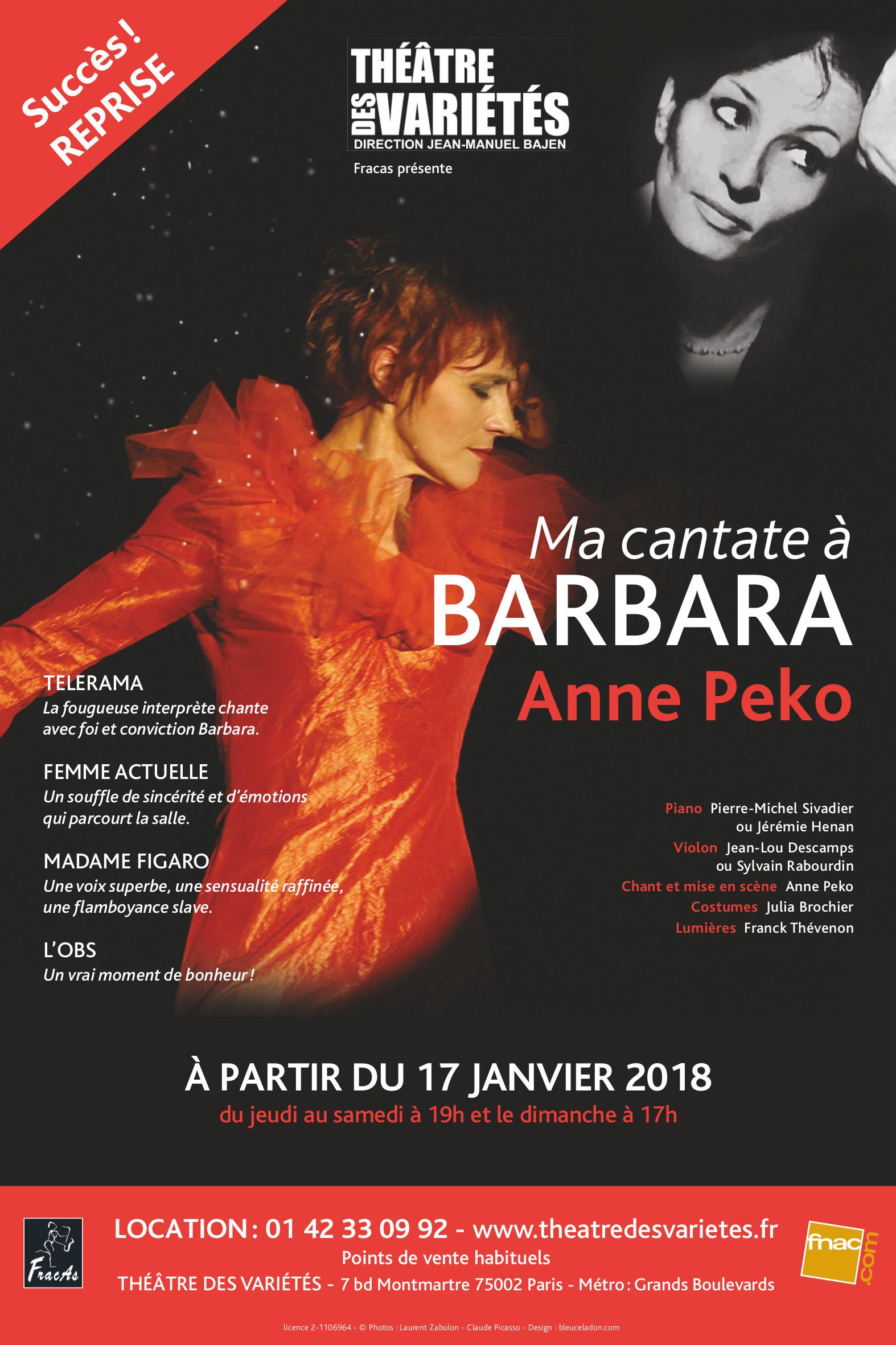 Après son succès au Lucernaire et au Festival d’Avignon, Anne Peko, subtile et flamboyante, de sa voix troublante et d’une sensualité raffinée, nous entraîne dans un magnifique voyage théâtral et musical au pays de la grand Dame brune, accompagnée par des musiciens complices, vibrants et passionnés. Un hommage d’une infinie délicatesse, personnel et lumineux où par des chemins buissonniers, la chanteuse, se réapproprie les personnages sortis de la plume alerte de Barbara.