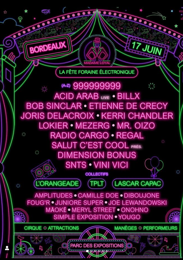 Bordeaux est en plein essor dans la musique électronique depuis quelques années et cela se ressent. Le fameux et célèbre festival Madame Loyal vient s’implanter pour la première fois sur Bordeaux, pour une édition avec une programmation house, trans, techno plus qu’admirable. En passant par des grosses têtes d’affiche comme Joris Delacroix, Bob Sinclar, 999999999, le célèbre réalisateur Quentin Dupieux aka Mr.Oizo sous son nom de scène, ou des collectifs bordelais ayant acquis une certaine notoriété dans le Sud-Ouest, avec Amplitudes, TPLT, Diboujone
