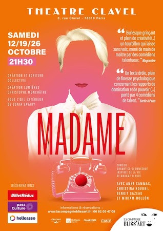 “Madame” est une comédie dramatico-clownesque créée par la Compagnie Bliss’Art, et librement inspiré de la célèbre proxénète Madame Claude. Cette pièce au burlesque grinçant et pleine de créativité est une véritable surprise de la rentrée théâtrale et sera jouée les samedi 12, 19 et 26 octobre au Théâtre Clavel.
