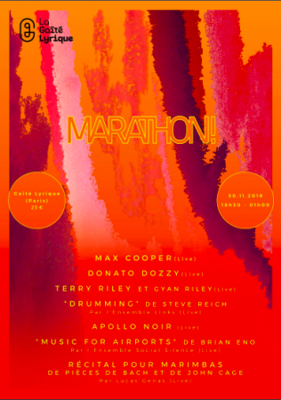 Une fois de plus, Marathon ! propose une programmation surprenante en réunissant sur un même plateau le grand compositeur américain Terry Riley, la figure incontournable de la techno italienne Donato Dozzy, le producteur électronique Max Cooper, l’artiste expérimental Apollo Noir, ainsi que les pièces “Music for Airports” de Brian Eno par l’Ensemble Social Silence, “Drumming” de Steve Reich par l’Ensemble Links et un récital de marimbas par Luca Genas.