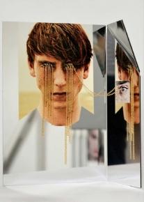 La salle de l’image : icônes. Il s’agit d’icônes disposées sur des étagères. Rien ou presque n’est accroché aux murs. Il n’y a pas de cimaises. Le matériau brut utilisé ici est l’image « pauvre » de magazine associée et la technique est celle du travail du miroir travaillé en collages, en mosaïque ou en incrustation. Le travail produit ainsi une forme doublement composite, dans sa fabrication et dans son intention.