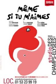 Avec leur psy, William, ils vivent un véritable parcours du combattant jalonné de séances de couple, de stages de groupe, d’exercices divers aux noms barbares : « rendez-vous sexuel », « espace exutoire d’injures », et autres « jeux de rôles »… dont ils sortiront bien évidemment transformés. Du rire. Des larmes. De la vie. Inspirée d’une une histoire vraie, « Même si tu m’aimes » est la pièce qu’il faut absolument voir si on est une femme ou un homme.