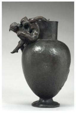 On oublie trop souvent que Rodin a débuté sa carrière comme sculpteur ornemaniste. Formé à la Petite École de dessin et d’architecture, Rodin travailla dans l’atelier de Carrier-Belleuse au début des années 1870. Il participa à plusieurs chantiers de décoration, du théâtre des Gobelins aux fontaines du Trocadéro, en passant par la Bourse de Bruxelles. Divers feuilles d’études, bustes décoratifs et éléments de décors monumentaux présentés dans l’exposition sont issus de cette période. En 1879, Rodin entra à la manufacture de Sèvres. Il produisit de nombreux vases, décorés de bacchantes, de faunes et d’enfants : Corps et décors en présente la plus grande série rassemblée depuis 1907, dont deux vases Shangaï récemment acquis par le musée.