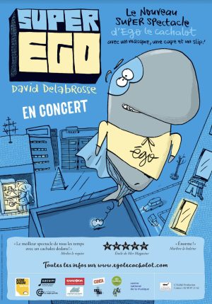 2016, Ego revient en super héros muni d’une cape, d’un masque et d’un slip. Préparez vous à la Egomania ! Derrière ce cétacé mé(ga)lomane, l’auteur-compositeur rennais David Delabrosse continue de parler aux enfants du monde complexe d’aujourd’hui de façon ludique et poétique. Dans un décor urbain à la fois réaliste et fantaisiste, il narre et chante la vie de famille de son « alter Ego», celle de son quartier dit «sensible». Avec sensibilité et humour, les chansons abordent à la fois des questions intimes qui traversent l’enfance, mais aussi des questions cruciales qui taraudent les humains comme le genre, l’écologie, les inégalités…