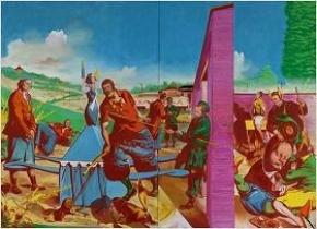 Débordant d’anachronismes, peuplé de silhouettes apparemment choisies au hasard, occupées à des tâches assez surréalistes, peints selon une vaste palette de nuances atténuées, les tableaux de Neo Rauch ressemblent à des illustrations de l’époque soviétique qui seraient passées dans une dimension lynchienne parallèle.