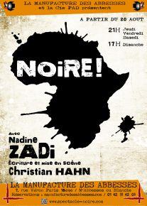 Noire! De Christian Hahn Mise en scène de Christian Hahn Avec Nadine Zadi Jusqu’au 1er novembre 2015 Les jeudis 21h vendredis 21h Tarifs: 24€ // 13€(étudiants, chômeurs, +de 65 ans) Réservation en ligne ici