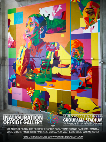 Créée à l’initiative de Guillaume et Gautier Mathieu du collectif lyonnais Birdy Kids en partenariat avec l’Olympique Lyonnais, Offside Gallery est une galerie d’art urbain installée au sein du Groupama Stadium, accueillant sur ses murs une sélection d’artistes établis ou émergents venus du monde entier.
