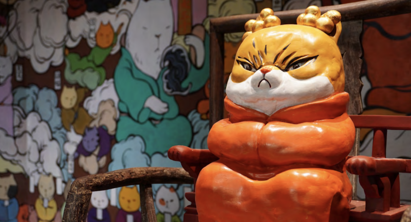 Bienvenue dans le temple du Chat de Wen Na. L’artiste invente ici le mythe du dieu des chats, symbole d’indépendance, de sensibilité et de mystère. Ce divin félin jouera ensuite le rôle de guide tout au long de l’exposition.