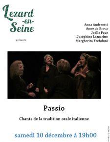 Samedi 10 décembre 2016, 19 heures L’association Lezard en Seine organise un concert de chants de la tradition orgale italienne Passio à l’Eglise des Billettes. Chacun de ces chants est celui d’un village, d’un peuple, d’une terre. Ils résonnent sur les pierres, dans les airs ou dans les églises. Les chants traditionnels italiens sont aujourd’hui chantés par des hommes et des femmes à la voix façonnée par la rudesse ou la douceur d’un paysage, par la musique d’une langue, par les travaux des champs, de la mer ou de l’usine. Passione di Barcellona (Sicilia)