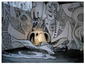 Ses installations juxtaposent peintures murales, graffs, collages, incrustations, céramiques et jeux de lumières et donnent ainsi une nouvelle âme au lieu. Du sol au plafond, l’artiste improvise une histoire, dans laquelle les obstacles et les particularités de l’espace deviennent un prétexte à enrichir son récit. Ses créations aux formes douces et généreuses, entre paysages aquatiques et visions urbaines, envahissent l’espace tridimensionnel de la galerie. Ses tracés malicieux faits de courbes bienveillantes nous aspirent et nous guident dans des tourbillons de luxuriants dessins aux accents surréalistes. Les détails sont foisonnants et vivaces. De l’infiniment grand, nous voyageons vers l’infiniment petit, en essayant de pénétrer son oeuvre par le dernier point de fuite sans jamais l’atteindre… Ruse de l’artiste pour nous faire pénétrer dans son univers, ou illusion d’optique ?