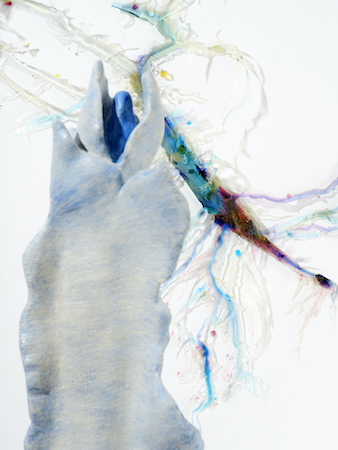 Elle développe un corpus de sculptures, installations et éléments textiles qu’elle articule autour de la notion de pulsion vitale. Pour elle, la peau, le corps brut et ses sinuosités intrinsèques sont des formes à pénétrer. Elle leur donne une substance en associant des matériaux détournés, rendus souvent aériens.