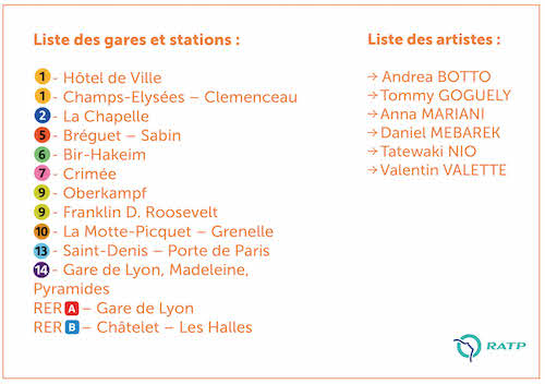 Créé en 2013, le programme “La RATP invite” permet à la RATP d’exposer régulièrement le travail de photographes – français ou étrangers, jeunes talents ou artistes reconnus de différentes époques – en le diffusant largement dans ses gares et stations. Ainsi, ont déjà été exposés sur le réseau : le festival Circulation(s), Harry Gruyaert, Richard Avedon, Yann Arthus-Bertrand, JR, Hassan Hajjaj, Sebastião Salgado, Vivian Maier, Boris Mikhaïlov, la Fondation Henri CartierBresson, Juergen Teller, Fisheye Magazine ou encore Wolfgang Tillmans. La photographie étant un art communautaire et une forme d’expression artistique accessible au plus grand nombre, la RATP souhaite enrichir constamment l’expérience de voyage de ses voyageurs en leur offrant régulièrement des moments de surprise, de découverte et de discussion.