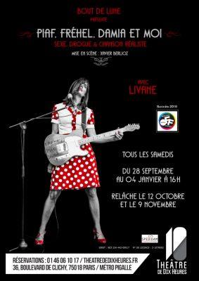 Avec humour et fantaisie, Livane tisse un fil entre nous et ces trois femmes, nous révélant des secrets oubliés. Elle allie ses talents de comédienne et de chanteuse, voyageant de l’un à l’autre comme de l’entre-deux-guerres à nos jours, de Piaf à Damia, de Frehel à elle-même.