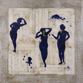 Mais son œuvre, empreinte d’un vocabulaire bien plus riche, qui n’est pas sans rappeler les décors de Pompéi, suggère l’exploration classique du corps et ses itérations modernes, et étudie la confusion entre abstraction et représentation. Dans son œuvre la plus récente présentée à l’occasion de l’exposition, il utilise le miroir comme une base horizontale, plutôt que comme un tableau ou une toile, ajoutant ainsi de la complexité à la démarche de visualisation.