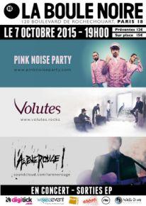 Pink Noise Party, volutes et l’arène rouge en concert Avec Pink Noise, Volutes, l’arène rouge Le mercredi 7 octobre 2015 à19h Tarifs : de 12€ à 15€ Réservation en ligne La Boule Noire www.volutes.rocks |