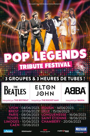Pop Legends réunit dans une même soirée les artistes jouant magistralement les plus grands groupes de l’histoire à savoir The Beatles, interprétés par The Bestbeat, Elton John interprété par The Rocket Man et ABBA par Mania.