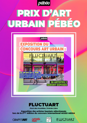 Du 29 mai au 13 juin prochain, Fluctuart accueillera l’exposition Prix d’art urbain Pébéo exposition réunissant les oeuvres de 36 artistes émergents de la scène du street art, découverts dans le cadre de la 5e édition du concours international MIXED MEDIA.
