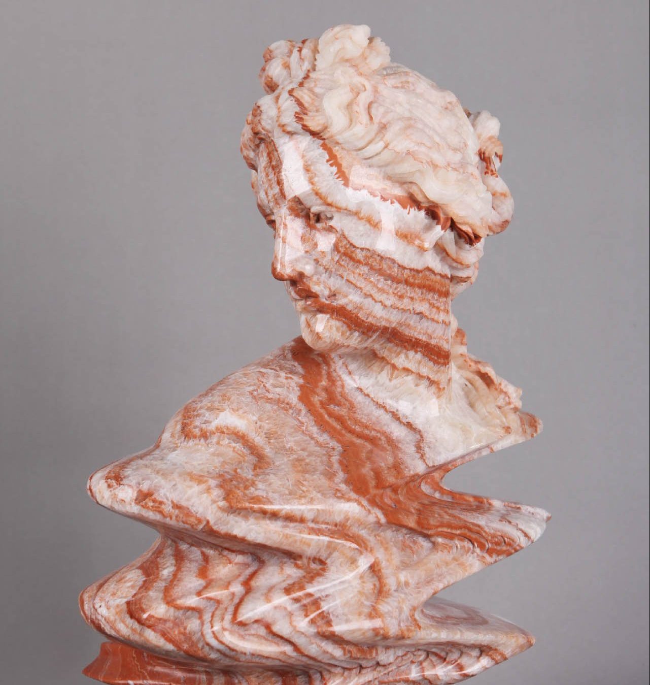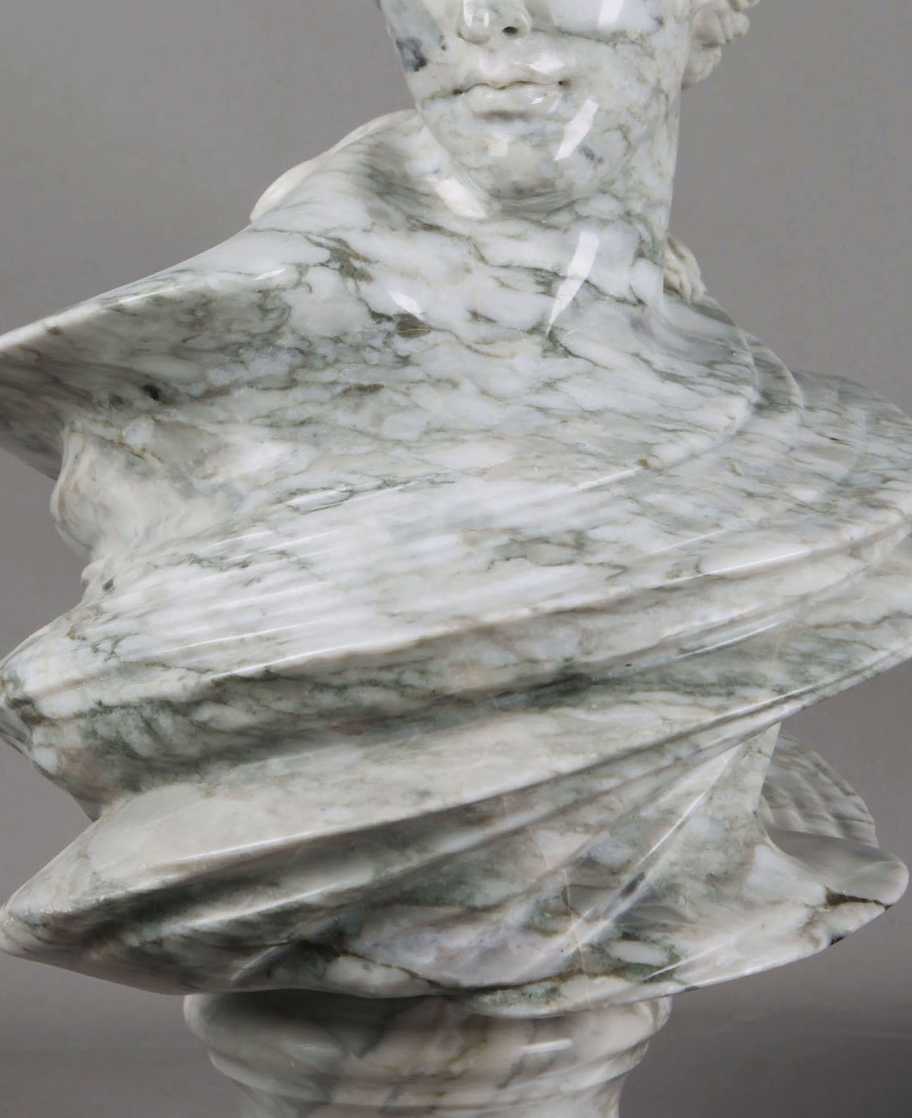 Ses différentes séries d’œuvres en marbre offrent une lecture du passé à la lumière du présent. Séduit par le veinage et la polychromie des marbres qu’il source dans toute l’Europe, il les contorsionne à l’aide de la modélisation 3D. Il tord, contracte, agite, bouleverse Aphrodite/Vénus, Hercule ou Jules César, les tirant de leur sommeil millénaire et figé.