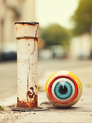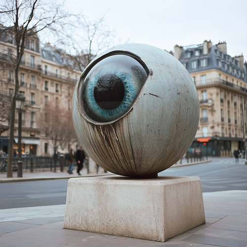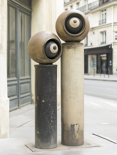 “Comme un dialogue entre la machine et l’homme, j’initie un jeu entre la vérité et le faux, entre le réel et l’irréel. Dans le but de questionner notre usage de la technologie et d’interroger les frontières de notre perception, j’ai manipulé un logiciel génératif d’images afin de produire des visuels inspirés de l’imagination d’un humain : des personnages cyclopes peints sur des potelets anti stationnement alignés sur les trottoirs de Paris. Une expérience créative artificielle issue d’une idée bien réelle que j’ai mainte fois explorée dans la rue ou en atelier.