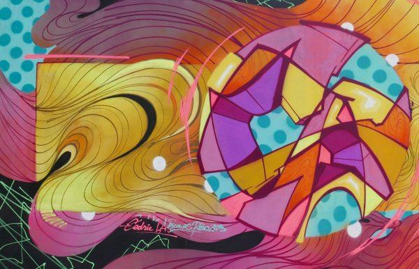 Le nom comme référence, la lettre comme support, un abandon du sens premier vers une abstraction assumée. RESO laisse s’exprimer sa spontanéité pour ne laisser parler que l’essence même de la lettre : la courbe. Cédric laisse le pinceau, le posca, la bombe emmener son trait pour laisser toute sa place au mouvement. De ce travail intuitif ressort l’énergie, le mouvement, la progression du geste, l’intensité d’une trajectoire, la vie enrichie d’expériences humaines et artistiques, représentant l’homme au-delà de l’artiste.