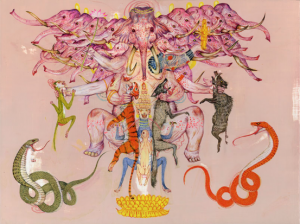 Mu Pan, c’est la rencontre entre Jérôme Bosch et Kuniyoshi, avec ses grandes peintures épiques et narratives, imprégnées de références culturelles et historiques au Japon et à la Chine et de pop culture américaine. Il naît à Taïwan en 1976 dans une famille originaire de Chine continentale puis quitte l’île et son histoire complexe pour New York où il émigre avec ses parents en 1997 lorsqu’il a 21 ans. Repartant de zéro avec sa famille, il adhère à la culture américaine non sans quelques appréhensions. Devenu citoyen américain depuis, marié à une Japonaise, Mu Pan cultive et revendique ses multiples identités culturelles dans ses peintures.
