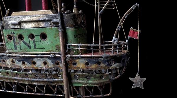 Déployant les lignes de ses dessins dans l’espace avec du fil de laiton, il donne corps à toute sorte de créatures et de machines à voyager auxquelles il apporte une note de nostalgie en y intégrant de vieilles boîtes métalliques et des objets trouvés. Un univers onirique à la recherche d’un monde meilleur.