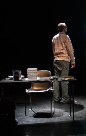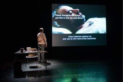 A dix-sept ans, Yasser, le frère de Rabih Mroué, subit une blessure qui le contraint à réapprendre à parler. C’est lui qui nous fait face sur scène.