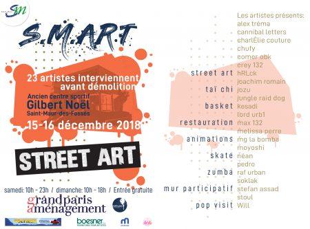 La naissance de l’eco- Quartier de la Varenne saint-hilaire, est un moment important dans la ville de Saint-Maur. A cette occasion, La Mairie de Saint Maur, accompagné du Grand Paris Aménagement ont à nouveau décidé d’y créer l’évènement, au travers d’un investissement artistique du gymnase Gilbert Noël, afin d’y créer un évènement éphémère ouvert 2 jours au public, les 15 et 16 décembre… S.M.ART !