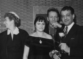 [Visuel : photo prise lors du vernissage – De droite à gauche : Ida Chagall, Dina Vierny, Charles Estienne et Serge Poliakoff]