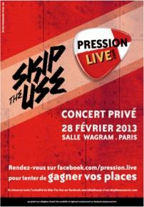 Pression Live a offert 650 places au public désireux d’assister au concert de Skip The Use ! Les places pour le concert étaient à gagner du 14 janvier 2013 au 10 février 2013 sur l’application mobile Pression Live ou via la Fan Page