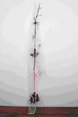 Si le rôle de l’artiste est de nous montrer ce que nous faisons de nous-mêmes : des sujets morcelés, angoissés et enchaînés à notre image, grisés alors que nous devrions faire briller nos feux les plus précieux, son rôle est aussi de nous donner une perception plus vaste, de relier notre sentiment intime et individuel à une vision d’ensemble. L’imposante sculpture Cosmos, dans la façon dont elle s’empare de l’espace de la galerie, avec sa construction de bois de charpente, ses avirons et ses boules de bowling colorés, nous transporte dans un dépassement de notre étroitesse terrestre, dans un jeu où le trivial rejoint les sphères célestes. Toutefois, l’une des caractéristiques de l’art de Delphine Coindet étant de ne pas manquer d’humour, le spectateur ne perdra pas pied dans cet univers poétique où les équilibres à la Calder le disputent aux boîtes de Cornell, cet artiste qui savait mettre à portée intime les planètes, le passé et le présent. Certes le propos est grave. Les données contradictoires de la sculpture soulignent la dialectique du danger dans laquelle nous sommes tous engagés. D’un côté, la structure de bois de charpente, son ordre quasi cubique, connotent la protection de nos logis ; les rames colorées ou de bois usé, les boules rutilantes ou chamarrées en appellent à un toucher rassurant, à un tentant divertissement. Mais la construction, ouverte à tout vent, ne montre que son incertitude à maintenir un équilibre, nous prépare à l’imminence des chutes, à l’aléatoire de cette physique que l’on sait désormais régie par les mathématiques du chaos. D’autre part l’oeuvre se fait métaphore de notre société, où chacun s’enferme dans sa sphère et où les chocs physiques et affectifs se distribuent par effets. De part ou d’autre, il est difficile de ne pas penser à la façon dont nous malmenons nous-mêmes et notre planète jusqu’au point où la rupture est imminente. Et pour trouver protection dans cette vision de l’univers, il ne nous reste qu’à ramer… Co(s)mique !