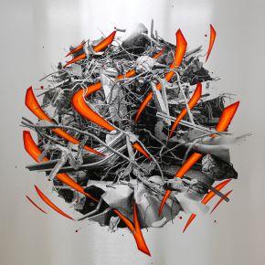 KATRE 2015 K-Ivry-Chaos KatreDeux nouvelles séries sont présentées à la Galerie Wallworks. La première est constituée de fonds sombres, préparés avec des coulures à l’acrylique, sur lesquels est apposée la photographie, ensuite illuminée par les mouvements de lettrages stylisés. Pour la seconde série, baptisée Cercle, Katre s’est intéressé de près à des matériaux trouvés au gré de ses visites dans les friches. Des amas de câbles, de barres de fer et de gravats surgissent de la toile sous la forme d’un cercle, comme s’il s’agissait d’un carottage – ces prélèvements du sous-sol terrestre obtenus à l’aide d’un tube effectué sur le terrain. Soudain ces échantillons de matière inerte évoquent un enchevêtrement végétal ou un cœur avec ses artères. Qu’il s’agisse des matières ou des ambiances de ces architectures vouées à la disparition, Katre n’a de cesse de traduire dans ses œuvres la beauté qu’il décèle dans des sites qu’il est parfois seul à découvrir. Sinon redonner vie à des édifices destinés à la destruction, il tend à restituer la mémoire de ces lieux oubliés.