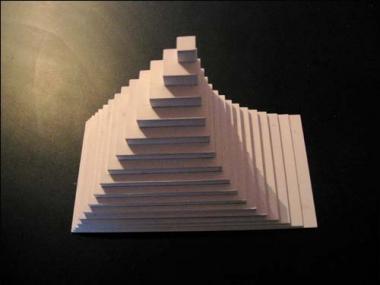 A la suite de ce rapport frontal, Samon Takahashi trouve un prolongement poétique dans une installation architecturale : Contrappunto dialettico alla mente. Cet escalier à la finalité absurde est une échappatoire aux restrictions de la technique utile, une invitation à l’élévation. Cette forme monolithique lumineuse semble être régie par une pensée mathématique et robotique. Il est, comme le titre l’indique, le contrepoint du constat d’aliénation par l’objet.