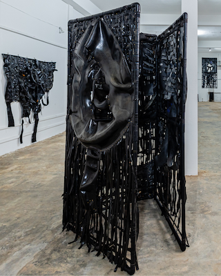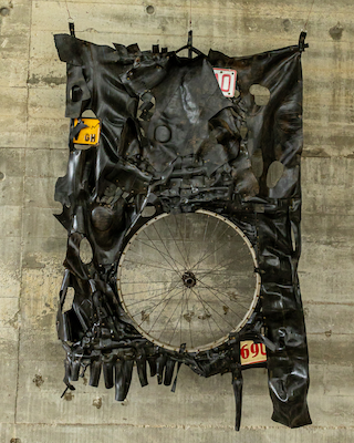 Dela Anyah, né en 1986 à Accra Ghana, est un artiste pluridisciplinaire créant des œuvres à partir de pneus, chambres à airs et plaques d’immatriculation usés. Réinvestissant les techniques de vannerie africaine, le plasticien crée des compositions abstraites dans lesquelles chaque dégradation de la matière raconte un récit. À travers son travail, Dela Anyah nous invite à repenser la valeur et la beauté des matériaux oubliés, tout en soulignant la dépendance de l’homme aux machines.