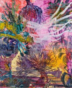 Cristine Guinamand nous plonge dans un monde imaginaire à la fois merveilleux et dangereux. Ses toiles monumentales peintes à l’huile délivrent un univers végétal et animal immergé dans les profondeurs du temps, de nos peurs et de nos fascinations. Il y a quelque chose de très primitif et de très sophistiqué tout à la fois dans son oeuvre. Des forces invisibles s’y affrontent, la puissance du monde et sa complexité y sont palpables.