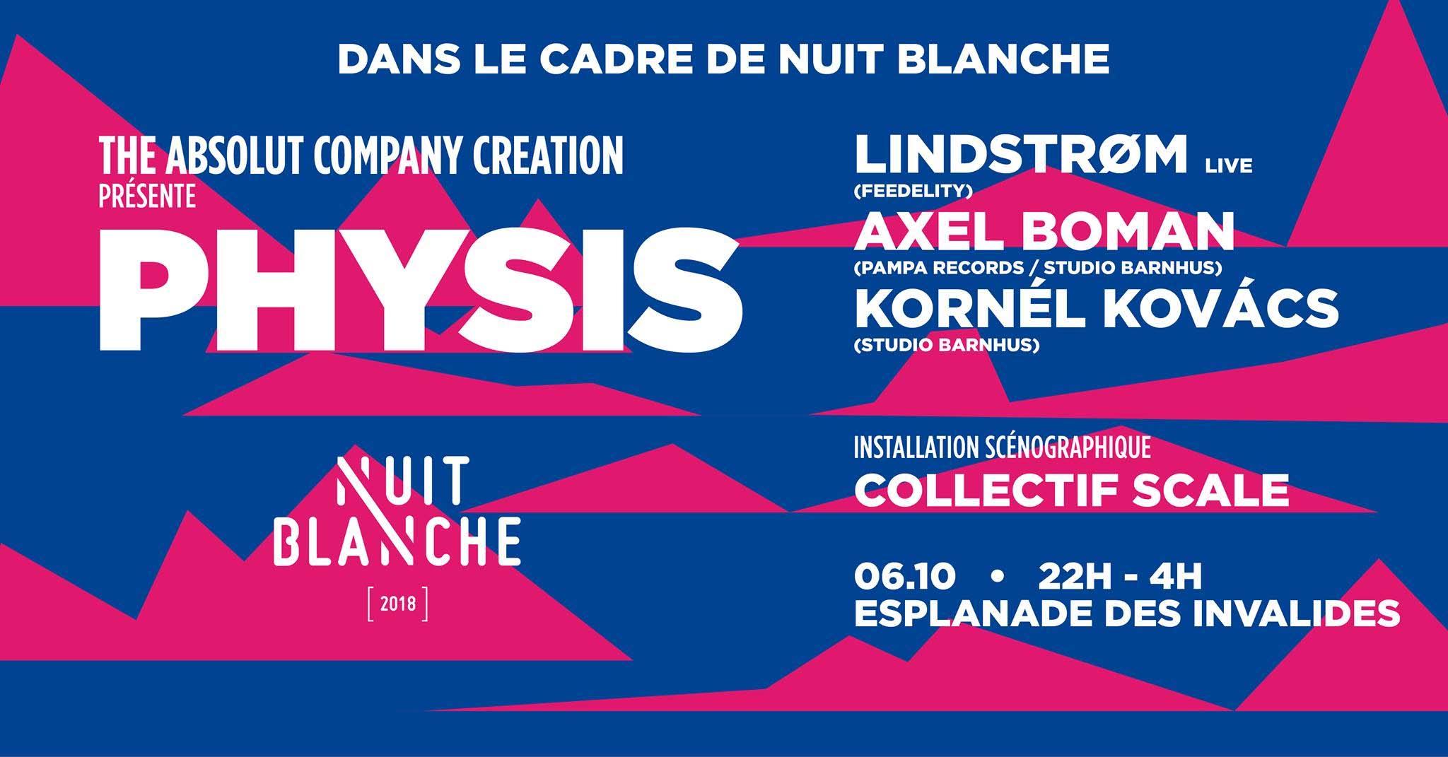 Physis accueillera pour Nuit Blanche trois DJs emblématiques de la scène électronique scandinave, avec une passion commune pour la house : Lindstrøm, avec une musique en équilibre entre deux mondes, terrestre et spatial, house et disco; Axel Boman, et son univers hypnotique fondé sur une house à la lenteur captivante; et Kornél Kovács, dont la house joue sur la pureté des émotions et des textures. L’espace d’une nuit, « mon Super Kilomètre » accueillera l’installation Physis sur la constellation des Invalides.