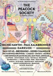 Programme Vendredi 11 juillet Darkside Live, Richie Hawtin, Kerri Chandler, Cassius , The Martinez Brothers, Omar S, Recondite Live et d’autres Samedi 12 juillet Paul Kalkbrenner, Brodinski, Tale Of Us, 1800 – Dinosaurs ( James Blake, Dan Foat, Airhead ), Jimmy Edgar, Agoria, Perc Live et d’autres *Evénement réservé aux personnes majeures* [Visuels: © The Peacock Society ] |