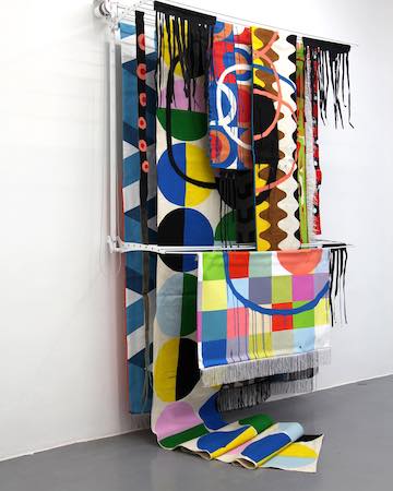 Est-ce que ce sont les couleurs qui s’entremêlent sur la toile, ou les toiles elles-mêmes qui semblent s’enchevêtrer ou se superposer ? Sommes-nous face à un tableau, une sculpture, une composition en volume, une installation ?