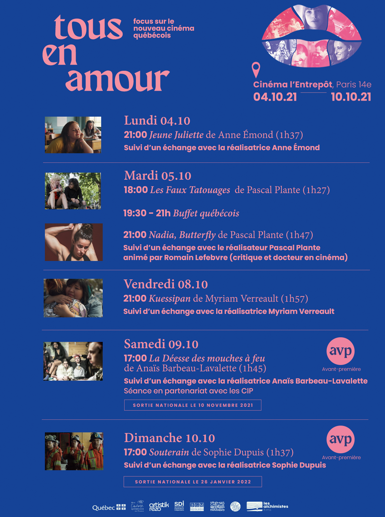 Au programme : Jeune Juliette, Les Faux Tatouages, Nadia, Butterfly, Kuessipan et les avant-premières exceptionnelles de La Déesse Des Mouches à Feu (sortie le 10 novembre) et Souterrain (sortie le 26 janvier 2022).