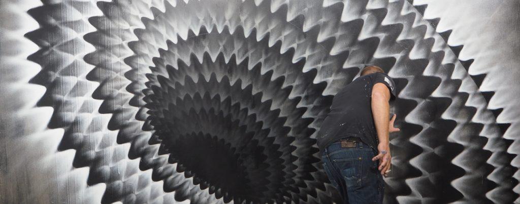 Une reflexion qui mène à expérimenter, voire fabriquer de nouveaux outils, afin de créer des oeuvres hypnotiques déclinées dans l’espace public comme dans son atelier.