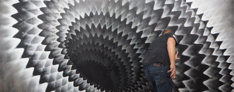 Comme il le ferait avec un métier à tisser, il utilise des spirales logarithmiques pour faire la chronique du temps qui passe et établir des parallèles universels entre le contrôle et le chaos. Exécutant une géométrie sacrée grâce à un pendule de peinture qu’il a fabriqué