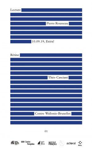 En satellite de sa venue au festival Extra! du Centre Pompidou, Le Centre invite le jeune auteur Théo Casciani dont le premier roman Rétine paraît aux éditions P.O.L. : une activation performative du livre à découvrir au cœur de la galerie du Centre – investie par des œuvres de plasticien.nes bruxellois.es.