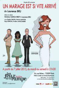 Un mariage est si vite Arrivé De Laurence Bru Mise en scène de Christian Garcia et Laurence Bru Avec Estelle Simon, Patrick Mancini, Gigi Ledron et Frédéric Anscombre Du 7 juillet au 19 septembre 2015 Tarifs : Réservation en ligne ou par tél. au 01.42.46.2619 Durée : 80 min Théâtre Les feux de la Rampe |