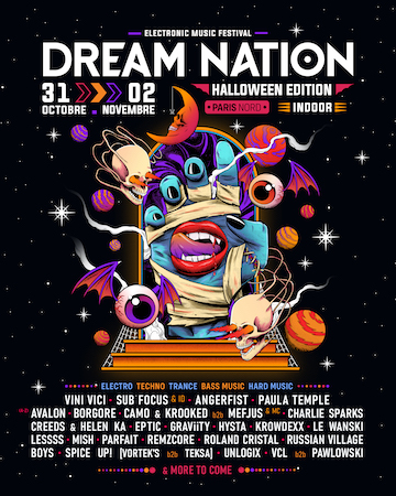 Dream Nation transcendera les frontières pour une immersion totale dans un monde où la musique électronique rencontre le frisson d’Halloween. Préparez vous à être emportés dans un décor immersif ponctué d’installations vidéo et de mapping 3D spectaculaires, de projections holographiques, de show lasers et une pléthore de créatures fantastiques et d’animations, pour une expérience où les frontières entre rêve et réalité s’estompent pour célébrer la magie d’Halloween.