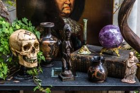 A cette luxuriance répondent des objets d’histoire naturelle : des insectes, des animaux naturalisés, des papillons et des pièces atypiques provenant d’Afrique (deux objets de la collection Claude Vérité), d’Océanie (une sculpture des îles Marquises de la même provenance) et même d’Europe comme un morceau de ceinture de chasteté, un compas à trois pointes ou un armillaire du XIXe siècle…